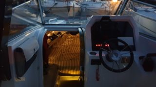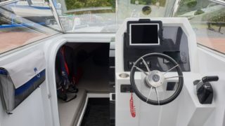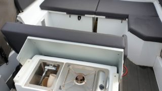 Integrerat kök i soffmodulen (spis, diskho, kylskåp 40l), fällbar kaptenssoffa och borttagbart bord, aktersoffa (4+1 personer), samtliga dynor, rymlig kabin för 2 vuxna + 2 barn (330cm lång), LED-takbelysning, läslampor, ljusslingor, 12V uttag + USB uttag, högtalare med förstärkare och bluetooth koppling, vindrutetorkare (2 hastigheter), självdränerande och automatisk länspump, bränsletank aluminium 250 l, batteriladdare C-Tec, vattentank 40 l, förpeke i rostfritt stål, badstege och dusch, däcksbelysning, undervattensbelysning.