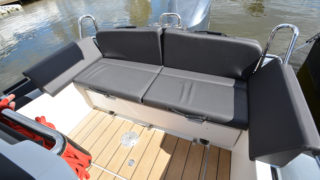 Fällbar kaptenssoffa, bord, bäddbar aktersoffa, soldyna, komplett med dynor, dimbar led-takbelysning. ljusslingor, 3 x 12v/usb uttag, vindrutetorkare, hypalontuber med halkskydd, självläns och länspump, fast tank 250l, peke i fören, badstege, höga grabbräcken i fören, T-top i glasfiber, för och akterkapell, lanternor, signalhorn, spotlights, solpaneler 100w på taket.