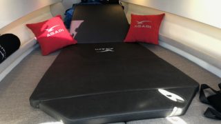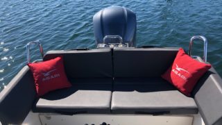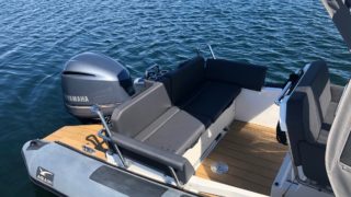 Standardutrustning: Pentrymodul, dynsats, bord till akterdäck, durkbelysning och undervattensbelysning, stereo (Fusion) med två högtalare, vindrutetorkare, länspump, badstege och kompositdurk.