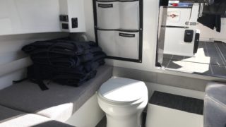 Standardutrustning: Pentrymodul, dynsats, bord till akterdäck, durkbelysning och undervattensbelysning, stereo (Fusion) med två högtalare, vindrutetorkare, länspump, badstege och kompositdurk.