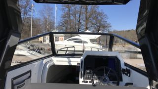 Extrautrustad med navigationssystem från Simrad (NSS12”), bogpropeller, scanstrut för tablet och smartphone, powersteering med ställbar ratt, black edition (rostfria detaljer i svart), toalettmodul med septitank, låspaket, ankare, förtöjningslinor, borste, bergskilar, reservdunk, fendrar (4st), verktygslåda samt tubreparationskit.