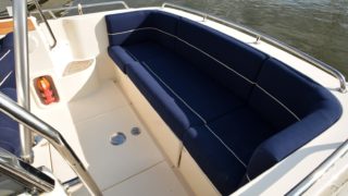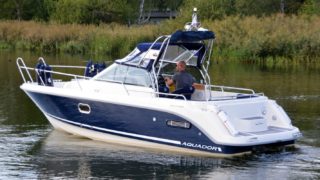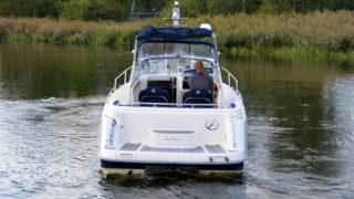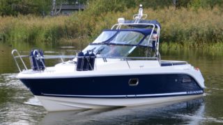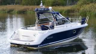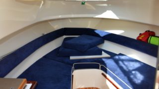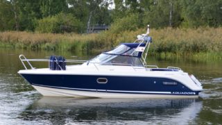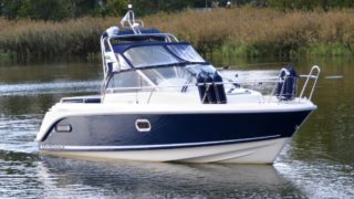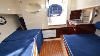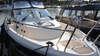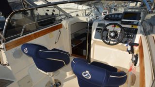 Utrustad med: Marinblåa skrovsidor, CD-stereo, diskho med vatten, Wallas pentry med värmelock, wc med septiktank, cd-stereo, 3-batterisystem, länspump, kylskåp, kapell, fjärrstyrd strålkastare, gångvärme med defroster, Garmin 720 med sjökort, startspärr, lanternor och signalhorn, targabåge, servostyrning, teak på badbrygga, bord, trimplan, vindrutetorkare x 2. Levereras med tampar och fendrar.