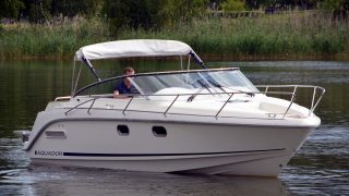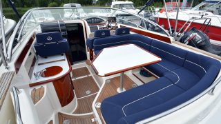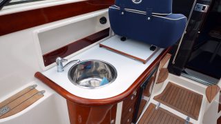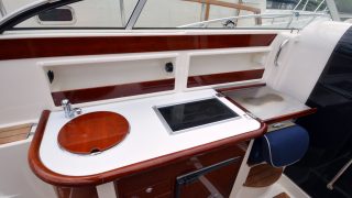 Aquador 26DC har en stor och luftig sittbrunn med en U-soffa i aktern som ger plats för 6 personer. det är även möjligt att bädda ner till solbädd. på BB-sida finns ett stort och rymligt pentry med två kokplattor samt ett kylskåp och diverse skåp/lådor.