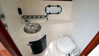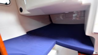 Nere i fören finns det sovplats för två personer i fören samt en stickkoj som ger möjlighet till sovplats för ytterligare två personer. det finns även ett separat utrymme med toalett och dusch.