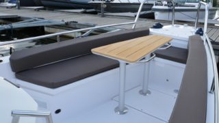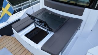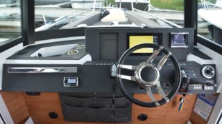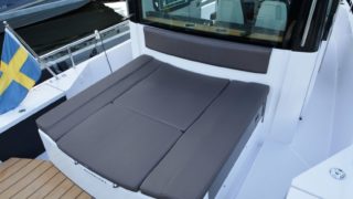 Utrustad med: Sverigepaket (Bord och dynor på fördäck, soldyna, dubbla batterier, trimplan med joystick, förtöjningspaket, pulpit, flaggstång med flagga, Komfortpaket (färskvattensystem, kylskåp, gasolspis, diskho, tryckvatten på toalett, teakbord i cabin, durkbelysning, däcksspolning, sökarljus med fjärr, soldäcksdynor på akterdäck med kapell, targabåge, landström med laddare, bottenmålning, bogpropeller, Webasto dieselvärmare, ankarspel i aktern med fjärr, Esthec durkar komplett paket, stävgummi och stävjärn, Garmin 7412 med sjökort, ekolod, Fusion ljudanläggning inkl 2 högtalare, motorlås.