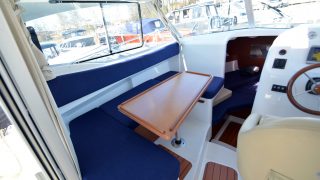 Dubbelkoj i fören, vattentoalett med tank, pentry, och stor bäddbar U-soffa med bord. Ljus och rymlig kabin. Ovanlig med det rymliga akterkapellet som denna båt har med värmeutblås utdraget.