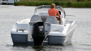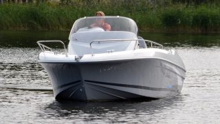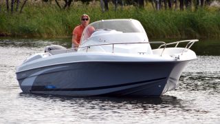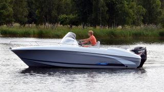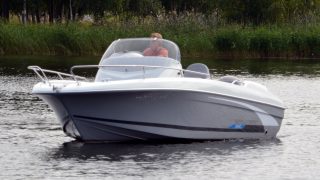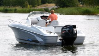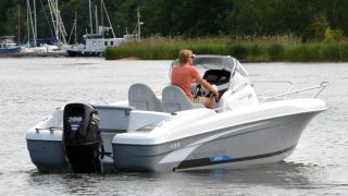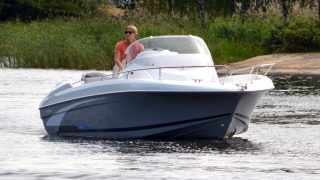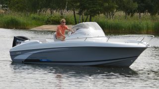 Öppen båt med nedbäddbart soldäck i fram och stort förvaringsfack framför styrplatsen.