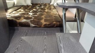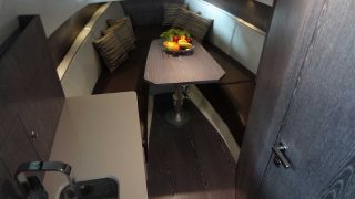 Båten ger dig en unik kombination av kabinkomfort och stora umgängesytor uppe på däck. Ombord finns ett välutrustat kök och det är högt i tak nere i kabinen. I förpiken finns en matplats som kan göras om till dubbelsäng. Bakom trappan ned finns också ett utrymme med en dubbelsäng. Gott om förvaringsutrymmen, elegant led-belysning och förstklassig inredning i trä, ger en lyxig atmosfär. På toaletten är det lika elegant med designat handfat, infälld blandare och duschhörna.