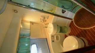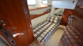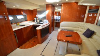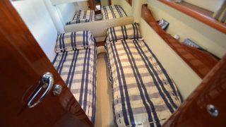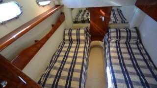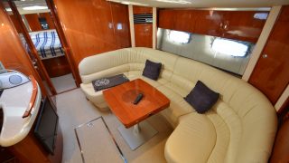 Stor salong med bra och fräscht kök, rymlig soffa med stor tv och många ljusinsläpp. På var sin sida om nedgången ligger separata kabiner med två sängar i varje. Stor captains cabin i fören med egen tv