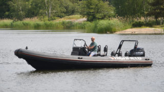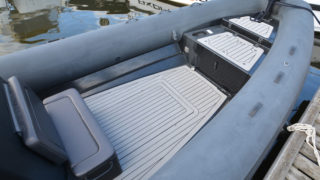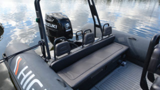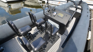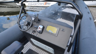 Utrustad med svarta tuber, elektroniskt reglage, softdeck, 4 fjädrade jockeybänkar, targabåge med lanternor, Garmin 9″ plotter.