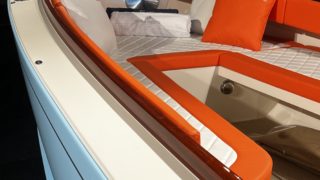 J-CRAFT BLUE / WHITE AND ORANGE UPHOLSTERY, Long Range Battery Pack (28,8 kWh), Heritage wood package, Carbon bimini top, Silvertex diamondstitch upholstery, Stainless cleats upgrade, Exclusive mooring kit, leather eye, 6 x fenders with quick lock mounts and covers with embroided logo, Stainless Steel Anchor 5 kg, Bang & Olufsen audio 4 x 7.7 SIG – BT Amplifier, LED mood light under deck & engine room.