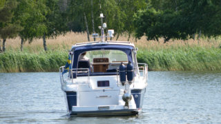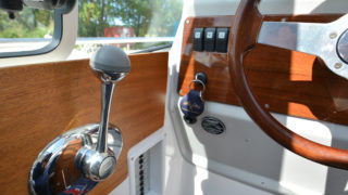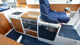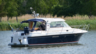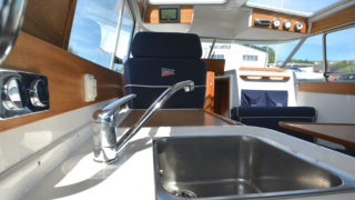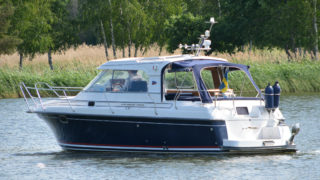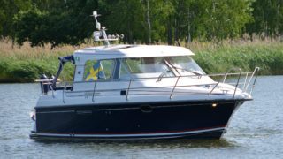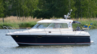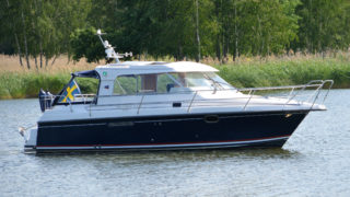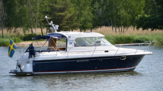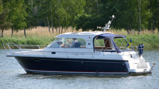 Utrustad med: bogpropeller, marinblåa skrovsidor, bottenmålning, ankarspel i aktern, dieselvärmare, gångvärme, ny Garmin 721 plotter med sjökort, kylskåp, 2-lågig gasolspis med ugn, varmt och kallt vatten, nyare akterkapell, trimplan, wc med tank, sökarljus, stereo, dubbla takluckor, teak badbrygga.