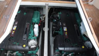 Båten är motoriserad med två Volvo Penta D6-370 med axlar som gått 480 timmar.