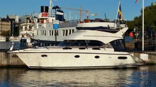 Denna båt är utrustad med bland annat fullteak, kapell för sittbrunn, frontrutor och flybridge, ankarspel i aktern med 20 kg RF Bruceankare, fjärrkontroll till ankarspel, bogpropeller, fjärrstyrd strålkastare på targabågen, dusch på badplattform, däckspolning med färskvatten och sjövatten, 2 x GPS/ plotter från Raymarine (E80), radar, logg, ekolod (inne och flybridge), autopilot, backkamera kopplad till båda plottrarna, magnetkompass, vindrutetorkare med spolning, trimplan, värmare och defroster, 17” tv med DVD, CD/Stereo i salong, högtalare 2×2, klocka, barometer och termo-/hygrometer i salong, kylskåp (130L), kombinerad kyl och frys (40L), köksfläkt över spis, varmluftsugn/micro/grill (230V), dubbel diskhoar, toalett med elektrisk spolning, septiktank, landströmsanläggning, batteriladdare Mastervolt (12/220V, 100A), inverter Mastervolt (220V 2kw), 3 x bäddmadrasser i alla kabiner, fällbar targabåge, larm från Trackguard med spårsändare.