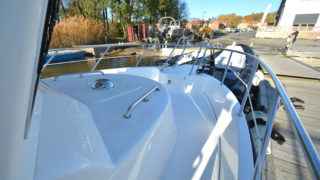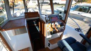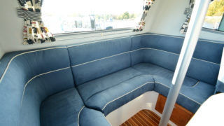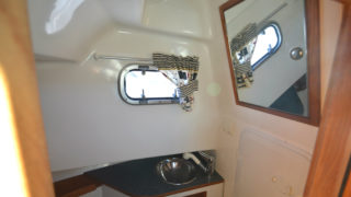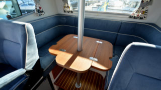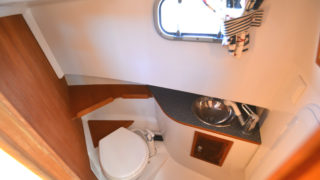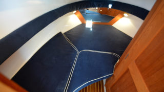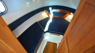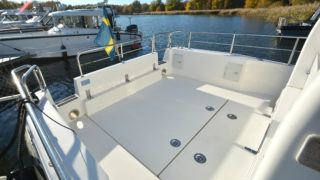 Stort plant akterdäck, portar till generös badplattform, höga relingar samt rejäla grabbräcken. Förruffen rymmer stor snedställd dubbelkoj och separat toalettrum.
