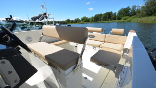 Extrautrustad med: Hardtop på rostfri stålram, stereo, badplattformar, dynor, fällbara sittbänkar, bord med bordsfäste, brandsläckare.