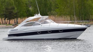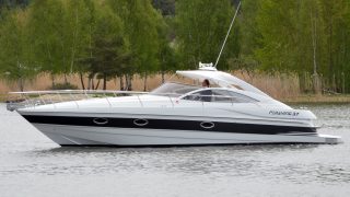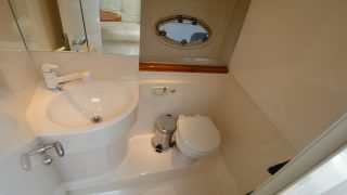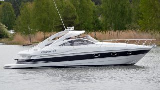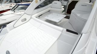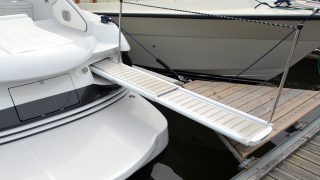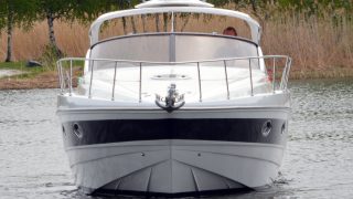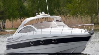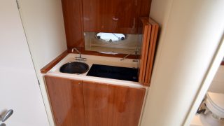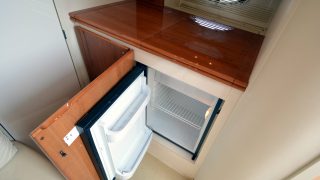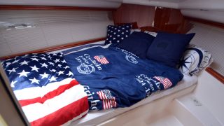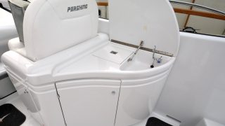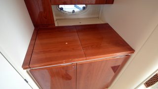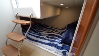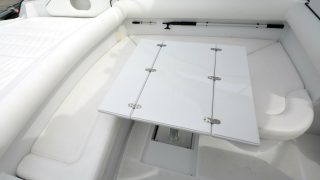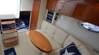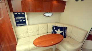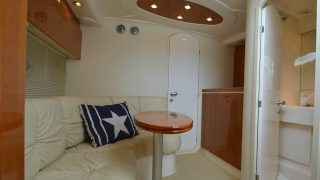 Planerad med en stor solbädd i aktern som öppnas elektriskt och under ryms motorer, elverk samt gott om förvaring. Vidare finns wetbar med stor kylbox och diskho samt stor sittgrupp med bord som fälls upp elektriskt. Bra förarplats med allt inom räckhåll. i kabinen ryms stor stickkoj samt l-soffa med bord, separat wc med dusch, pentry med diskho, kyl och spis. Separat förkabin med sneställd dubbelsäng.