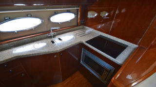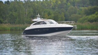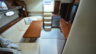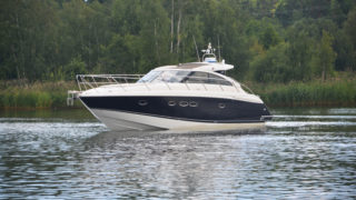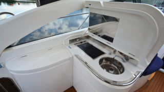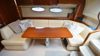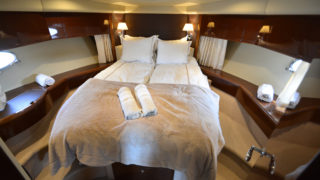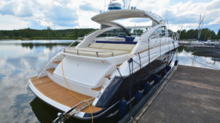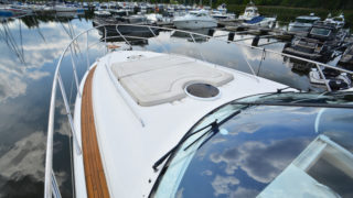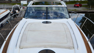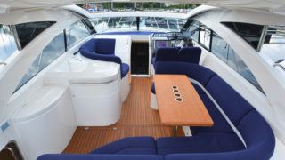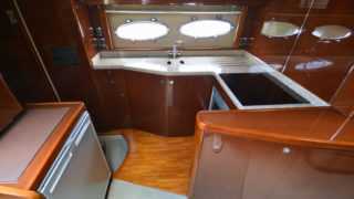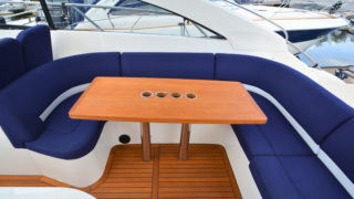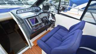 Utrustad med praktiska funktioner som bogpropeller, elverk, ankarspel både fram och bak, värmare, fräsch bottenmålning, eleganta blå skrovsidor och en praktisk elektrisk hardtop. Dessutom prydd med lyxigt teakdäck både på skarndäck och akter, dubbla kylskåp och spisar för de långa dagarna på vattnet.