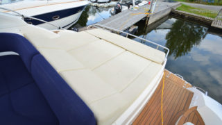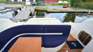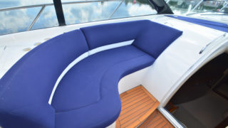 Båten är snyggt inredd med blå dynor uppe i salongen och även uppdaterad med Zipwake trimplan för smidigare och behagligare körning.