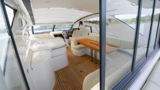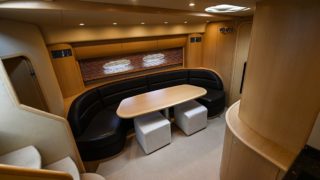 Snygg färgsättning med dem vita skrovsidorna i kombination med den ljusa mattlackade ekinredningen, ljusa dynor samt mattor, allt för att få en ljus interiör.