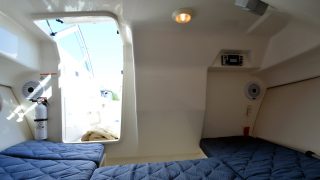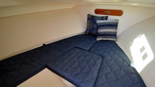 Öppen och rymlig sittbrunn med bord på akterdäck som går att fällas ned till en solbädd. Beigefärgat körkapell med bakstycke som är på genomgång. Övernattningsbar ruff för 2 personer.