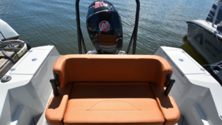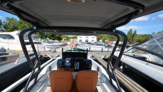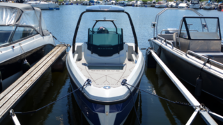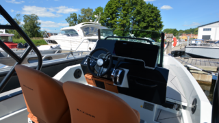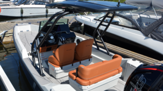 Side-by-side seating and aft sova, Blue hull with tangerine upholstry, Targa arch with T-Top, Soft dock on the large compartment hatch, Front dock cushion, Water ski pole, Sleeping Camperstyle Tent with window on front deck, 12V outlet, Swimming ladder, Harbour covers – seats and console – side-by-side, Simrad GO9 XSE (inkl. Mercury Vessel Wiev Link), Ekolod, Motorlås utombordare, Stöldmärkning Securmark vattenskoter (sats 2500)