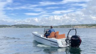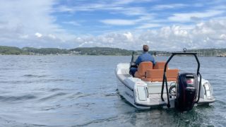 Jockeysäte för tre personer ink ryggstöd, hydraulstyrning, lanternor, dubbla länspumpar, fast bränsletank (110L) med nivågivare, hållare för brandsläckare, soft däck i sittbrunnen och på sidosteg (ej fördäckslucka), dubbla mugghållare på styrkonsoll, 12v uttag, förvaringsväska under ratt på konsoll, Mercury Vessel view mobile, larm för låg batterispänning, signalhorn, justerbar vindruta. Färgkombination: Ljusgrått skrov / röda detaljer.