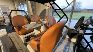- Side by side säten och soffa samt blå foliering på fribord och mandarinfärgad klädsel
