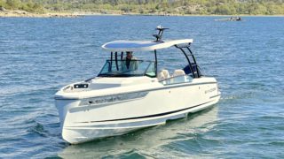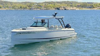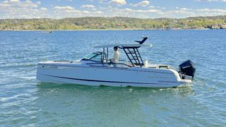 Vacuum infused hull, Bow handrails , Anchor storage, Navigation and anchor lights, Lewmar flush hatch in front cabin – 44 cm, Front cabin ventilation, Cupholders in bow area , Side windows, Bow fashion stainless plates, Hull stripes, Electrical wipers for windscreen, Horn, 8 cleats, Softpainted console panels, Leather steering wheel, Cupholders on console, Map pocket, Front cabin sliding door with lock, 5 separate seats, Harbour cover for console and front seats, Stainless steel bumper list, Bathing ladder, Aft handrails, Fender and mooring storages in aft, Flag pole fitting, 3 automatic bil