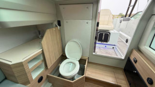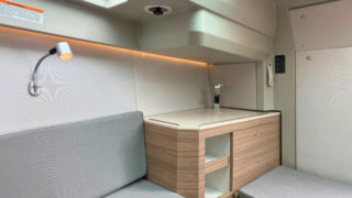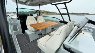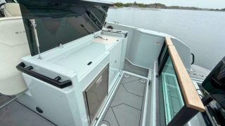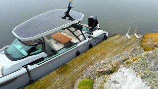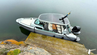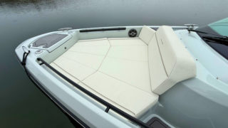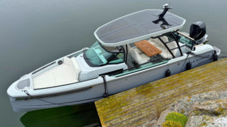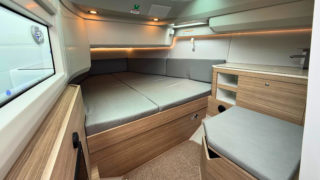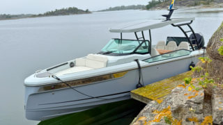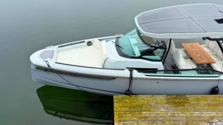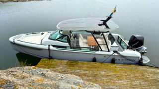 Detta exemplar är extrautrustad med: – ”Sahara sand” upholstery (light gray with brown stitching) – Deep gray – SkyTop Roof – GRP frame with dark tinted plexi. Light weight roof to replace the ”Soft Top” – Fresh Water Package, electric toilet, sink and tap in cabin, shower on aft deck – Wetbar Package, including frigde (available only with fresh water package) – Bow thruster SE40 (with pre-rig harness for extra battery – battery not included) – Automatic trim tabs – Single MFD Simrad NSX12 – Echosounder P79 in-hull transducer – Basic Audio package. 4 x 6,5″ Speakers – Cockpit teak table with cover (included in Seating Layout Upgrade 1) – Drawer fridge 16L in GRP box under helm seat – 12 volt – starboard – Glass gates in the aft – Webasto 2000 air heater + separate diesel tank – Front sunbed cushions including harbour covers – Harbour cover for the aft seats (wetbar or sofa) – Soft deck on deck (gray with black stripes) – Deck lights
