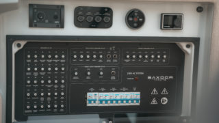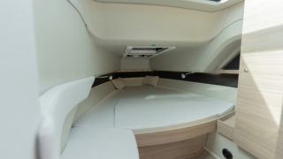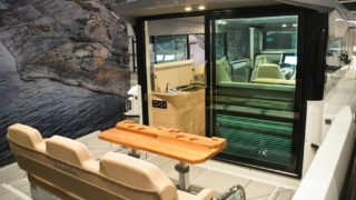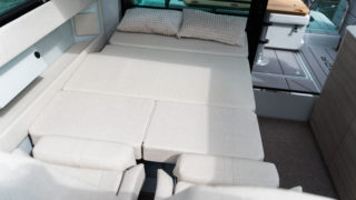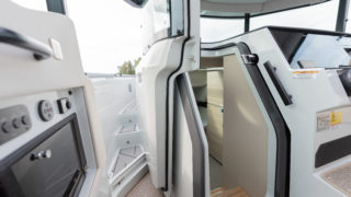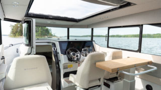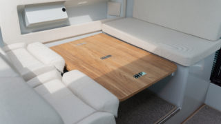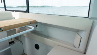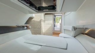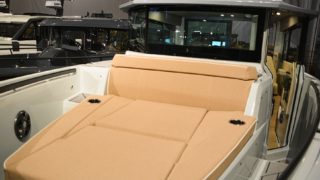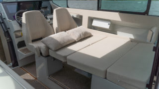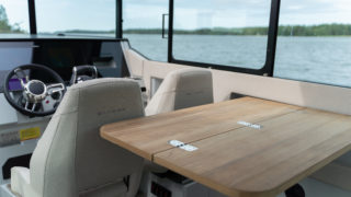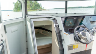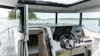 2 X MERCURY V8 AMS 300, Beige gray – GELCOAT, Coffee with cream upholstery, TWIN ENGINE TECHNOLOGY PACKAGE (bogpropeller, Mercury joystickstyrning med skyhook och autopilot), INFORMATION DISPLAY AND ENTERTAINMENT PACKAGE (dubbla Simrad 12″, stereo och ekolod), TOILET AND FRESH WATER PACKAGE, Automatic trim tabs, Shore Power (EU 230 V with 40 Ah charger), Diesel stove (available only with heater option), Heater for front and main cabin (Webasto AT4000), Simrad HALO20+ radar, Deck and bathroom handheld bidet shower, Soft deck flooring, Curtains in front cabin and mosquito nets, Harbour covers including cover for front sofa, aft sofa and blinds for main cabin windows, Sleeping solution in main the cabin, Aft deck seating module with upholstery, Front deck upholstery, Fridge in the kitchen module, Deck lights, Main cabin floor lights, Side glasses with opening windows, Säkerhetspaket, Sjökort Simrad.