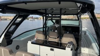 Standardutrustning, Båt funktioner, Manuellt öppningsbara sidoterrasser, Akter solbädd med justerbart ryggstöd inkl förvaring under, Wet-bar modul, Integrerade grabbräcken på däck, Fixed side wings för enkel ombordstigning från sidan, Teleskopisk badstege, Luckor på fördäck för enkel åtkomst, Soft deck på soldäck i fören, Handtag och Knapar, Två flusch-monterade däcksluckor, Snabbfäste för fendrar, Halkskydd på däck och luckor, Tekniska funktioner, Hydraliskt styrsystem inkl justerbar ratt, Mercury VesselView 502, Mercury VesselView Mobile, Mercury Active-Trim, Mercury Stöldskydd, Sladdlös laddning och 12V uttag, LED Navigations ljus, Länspump manuell & elektrisk, Fast bränsletank inkl. nivågivare, Trimplan, Brandsläckare med ”fire port”, Komfort funktioner, Uppfällbart bord justerbart i höjd, Komfort- och läslampor, Frontkabin inkl dynor, Mattor i förkabin, Gardiner inkl. myggnät i förkabin, LED lampor invändigt, Soft deck på lägre däck, Spegel i förkabin, Kopphållare på fördäck och i wet bar, Skrovdekaler, Läderklädd ratt, Kopphållare i konsoll och för passagerare, 12v uttag och sladdlös laddning, Glashållare i konsoll, Däcksventiler, Hamnkapell ink. kapell för solbädd, Mistlur, SAXDOR dokumentationsväska