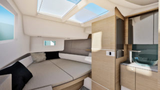 The lower deck includes a spacious forward double cabin with a separate toilet, and an aft cabin for two, both with large windows that flood the interior with natural light.