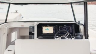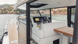 The bright wheelhouse, with large glass sliding doors and roof, invites an abundance of sunlight while further enhancing the ease of movement. The ergonomic helm station features a front sofa for three, ensuring great visibility and comfort. While at rest the sofa can be turned to create a cozy dinette, perfect for indoor socializing.