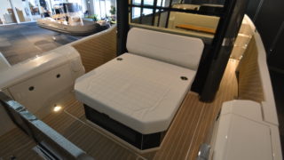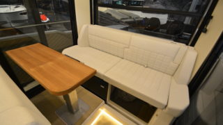 Up and down going electric aft glass window Helm sofa – electrically operated Refrigerator in wheelhouse