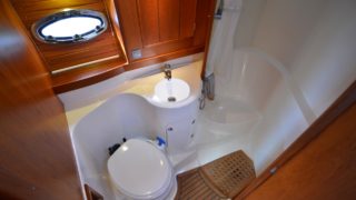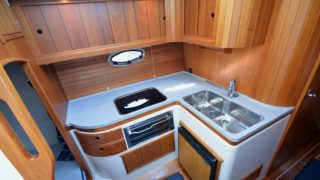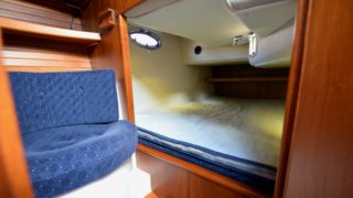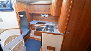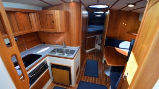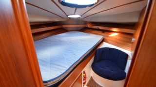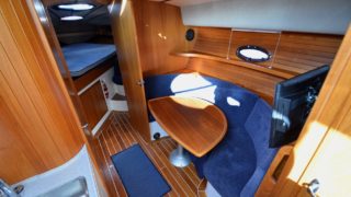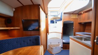 Båten är mycket välplanerad med 3st kabiner (6st sovplatser) med tjocka formsydda bäddmadrasser, 3st soffgrupper, en utvändigt och två inne, luftigt kök med gasol spis/ugn och 65L kylskåp, ”wetbar” med ett extra 65L kylskåp samt toalett med eget duschutrymme. Båten kan jämföras med exempelvis Windy, Nord West, Forbina, Marex mm.