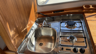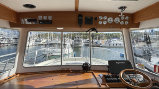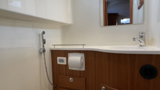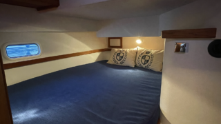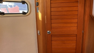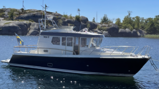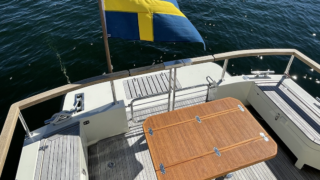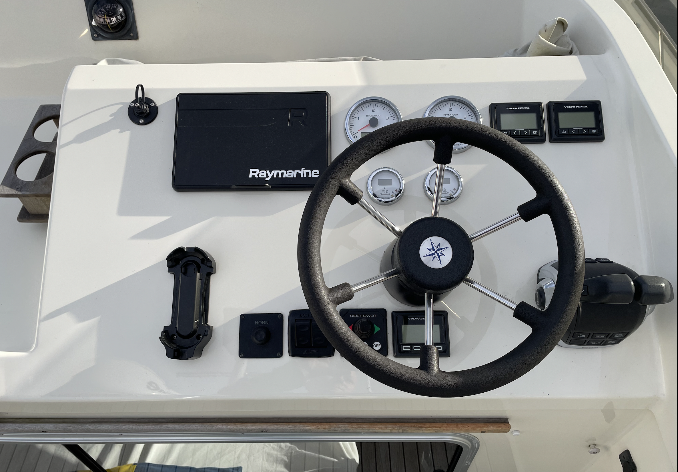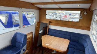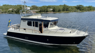 Extrautrustad med: Bogpropeller (extra kraftig 80kg dragkraft, inkl. backupbatter) Ankarspel i aktern med 50m blyad tamp, reservpropellrar inkl hållare monterat i maskinrummet, gasdämpare till motorluckor, ljudisolering i skrov samt under kojer 80%, Teakbord på fördäck, fällbart med förvaring i sb Fack, Extrafäste för teakbord på akterdäck, Värmare Eberspächer D4, extrakraftiga utblås i hytt och akterkkabin, Förlig kabin och wc, Led-ljuskabel under kepsen med dimmer o Kapell över instrument samt ratt och reglage. Färg:naturvit, Mätare samt givare till septiktank o Sjövattenspolning för wc Istället för sötvatten. Varmvattenberedare 20L, Halogenspotlights 4 st i tak, Bord i salong, Targaservis för sex personer med tallrikar, skålar, muggar, glas, bestick. Dörr till akterkabin dubbelvikt och Takluckor med gångjärn 2st. Lewmarpilot 60, Rullgardin och myggnät, Fönster i skrovsidor ej öppningsbara, Langeterad matta i hytt, Soffa nedfällbart ryggstöd, Uppfällbara klaffsittsar 2st på hyttens aktervägg, Landströrn 230Vmed 5st uttag samt 25m landströmskabel, Batteriladdare, Antikorrisionssytem, Durkbelysning, Vindrutetorkare uppgradering med intervall och 2 hastigheter, ej spolning. Arbetsljus på hyttaket fram samt på targabåge akterut 2x55W. Raymarine C125 Multifunktionsskärm, Gpsantenn Raystar, Raymarine, Digitalradar 4kW18″Ekolodsmodul downvisiongivare, Mörkblått skrov med dubbelvit vattenlinje, Nåtad teak på durk runt om samt flybridge, Bottenfärg med epoxibehandling, Färg svart och Räcken i rostfritt på bådasidor av hytten, Rostfria lanternor och Förvaringslåda/sittplatsakterdäckshörn, 2st förvaringslådor i aktern med teak, öppning i teakräcke, Stävstege, Däcksstolar, och tillhörande förvaringslösning under styrbord motorlucka, Lastplattform i motorutrymme framför motorerna, VHF Ray90, med extra handenhet för flybridge, Raymarine Axiom 9 plotter för flybridge