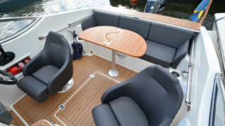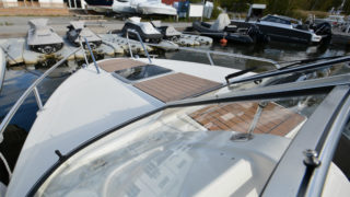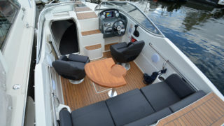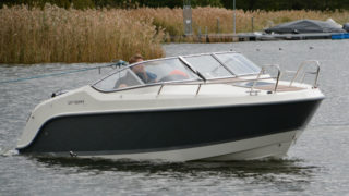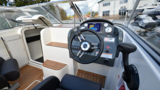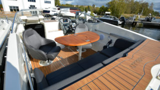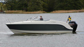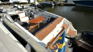 Utrustad med bl.a: Simrad plotter med sjökort, kylbox, vattenskidstång, porta potti (ej använd), dubbla batterier, förtöjningspaket, motorlås, plastlaminatdurkar, gråa skrovsidor, hydraulstyrning, Fusion stereo med blåtand, bord med fot, dynor, akterkapell, kapellgarage, hamnkapell, m.m.