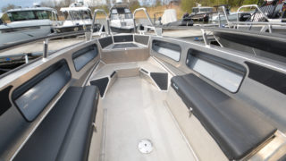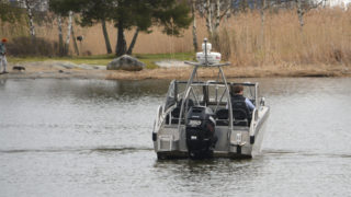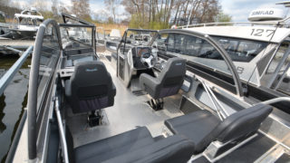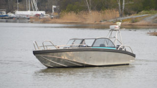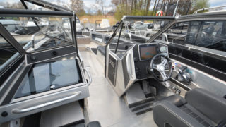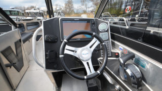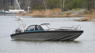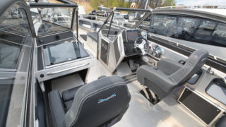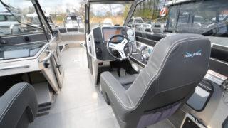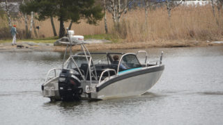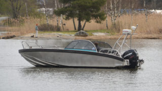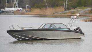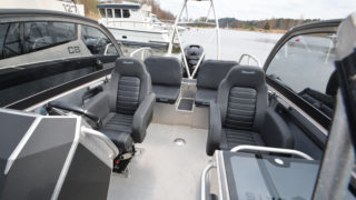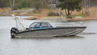 Båten är motoriserad med en Mercury Verado SCI 350 hk, Powertrim via blinkersspak på ratten, elektronisk handspak och fotgas.