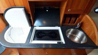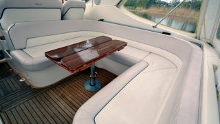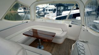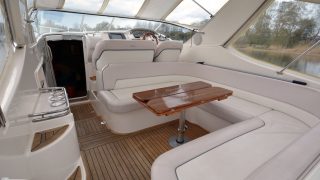 Ombonad stor sittbrunn med U-soffa i aktern samt ett kylskåp infällt på babord sida vid targabågen.