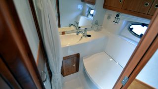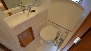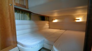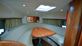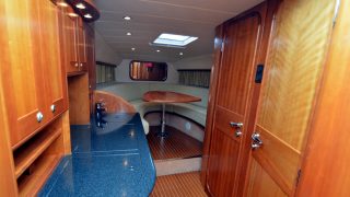 Stor salong med mastercabin i fören samt en kabin på babords sida med egen ingång till toalett med dusch.