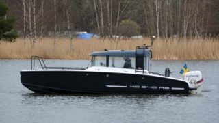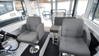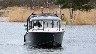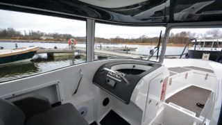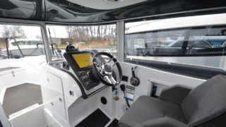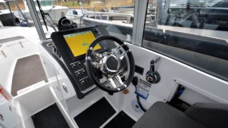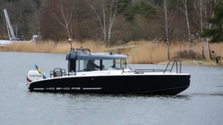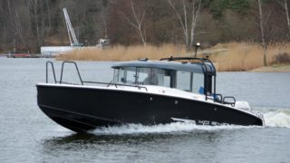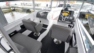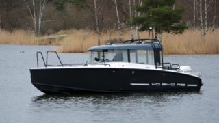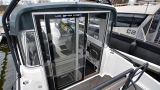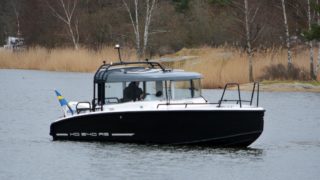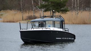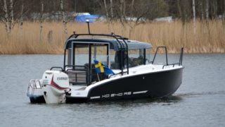 Nu får vi in denna XO 240 RS Cabin, en modell som blivit väldigt populär tack vare sitt skrov på 24 grader vilket gör att den går mycket bra i grov sjö.