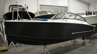 Båten står inomhus i vår varmhall, redo för nästa säsong.