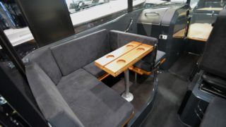 Bottenmålning svart, Webasto värmare EVO40, Simrad plotter NSS12 med sjökort, Simrad ekolod, bogpropeller, sökarljus Marinco med fjärr, förtöjningskit, flaggstång med flagga, avbärarlist D-profil 1/2 båtens skrovsida, stävgummi, extra sittplats på akterdäck med fenderförvaring och aktergrindar, grabbräcken på taket utvändigt, grabbräcken invändigt i taket, elektriskt wc med tank, kylskåp under förarplats, ytterligare 12v uttag, bord i salongen, fullfjädrad förarstol XO exclusive, färgsättning svart.