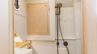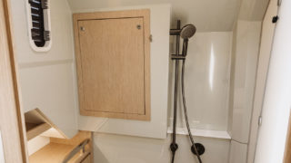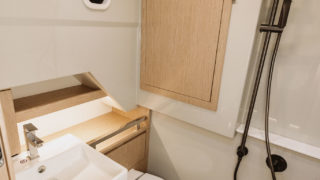 Främre kabinen har en stor dubbelsäng, duschutrymme, gott om takhöjd och stiliga detaljer.