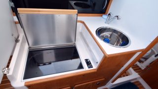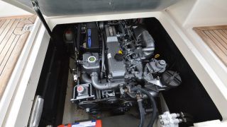 Båten är motoriserad med  Yamahas 165 hästars inombords dieselmotor samt ett duopropp drev.